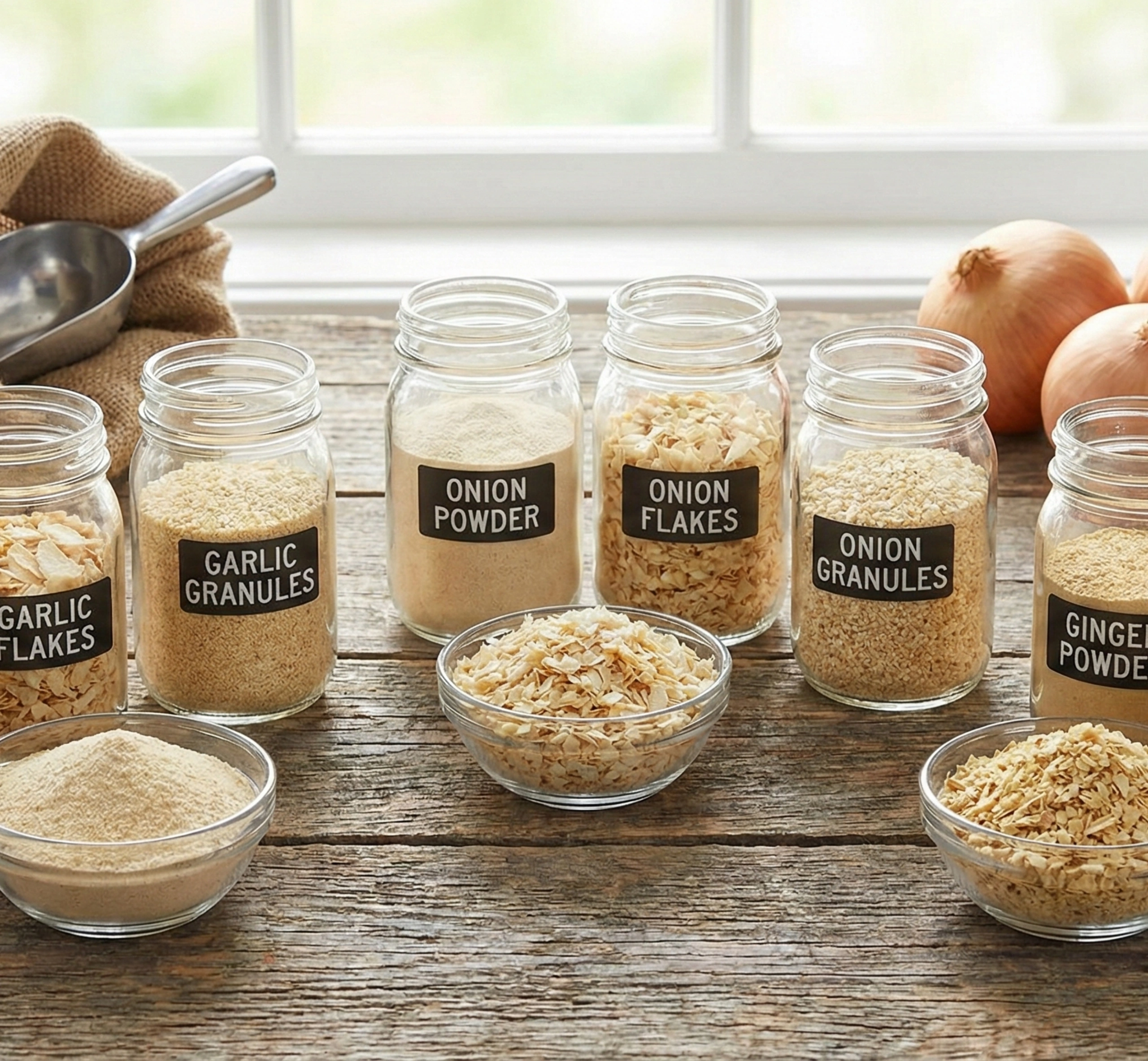 High-quality dehydrated garlic, onion, and ginger powders, flakes, and granules produced using controlled drying processes to ensure long shelf life, purity, and industrial-grade consistency.